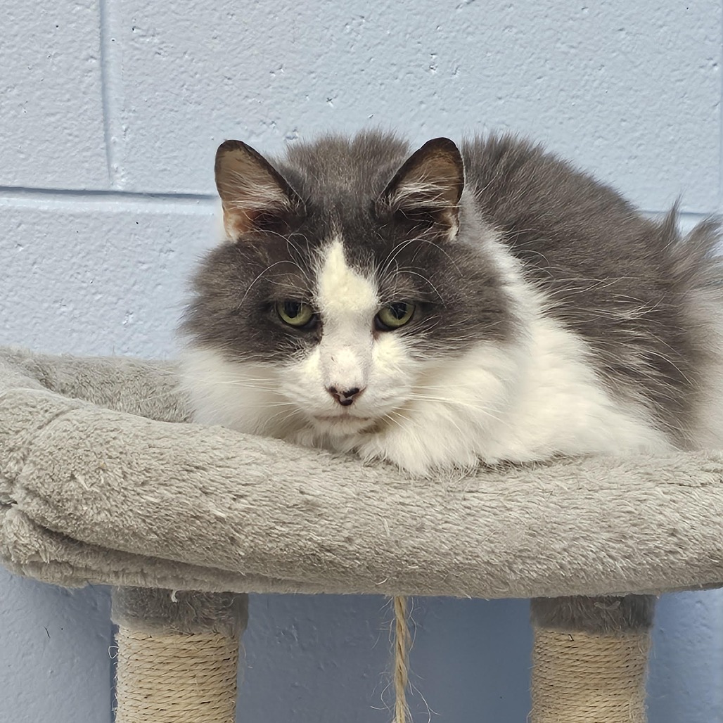 Meet Squirrel, an adult domestic long hair cat. Since he is long haired he will need to be brushed which he seems to enjoy. He came in with some matted fur which lead us to shaving him prior to placing him up for adoption. He is freshly groomed and ready for his new home. It does take him some time to warm up to people so you just need to have some patience with him. After that he will show you his lovable self. He does enjoy getting pet and when you stop he’ll look at you with the face of why did you stop. If you think his handsome boy is a match made in heaven come on in today and meet him.